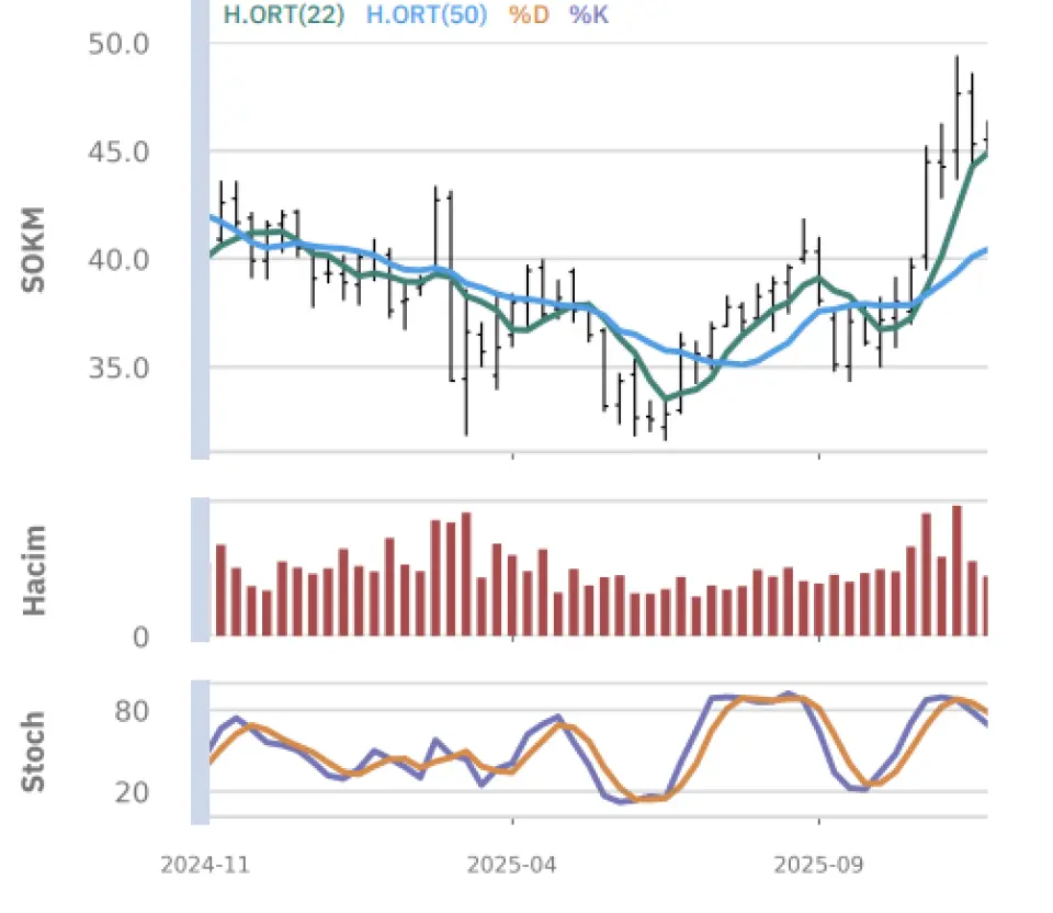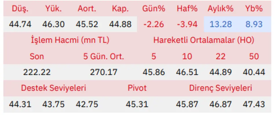 "Gün içinde en düşük 44.74 en yüksek 46.30 seviyesini gören Şok Marketler Ticaret hissesinin günü %2.26 kayıpla tamamladığı gözlenmektedir. Pivot seviye 45.31 seviyesinden geçmekte olup, aşağı yönlü hareketlerde birinci destek 44.31, ikinci destek ise 43.75 seviyesinden geçmektedir. Dirençler ise sırasıyla 45.87, 46.87 seviyelerinden geçmektedir. Bu aşamada endeksin 5 günlük HO seviyesinin %2.15 altında, 22 günlük HO seviyesinin ise %0.03 altında hareket ettiği dikkat çekmektedir. Son gün işlem hacmi ise bu aşamada 5 günlük ortalama işlem hacminin % 17.75 altında gerçekleşmiştir."