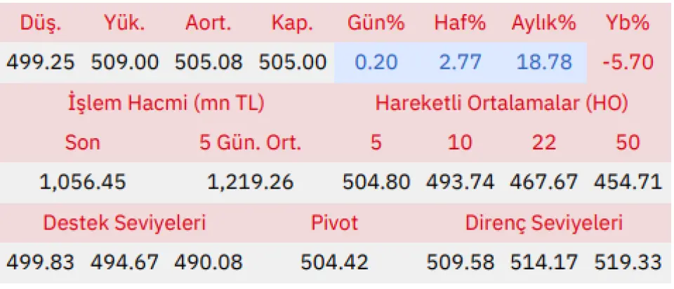 "Gün içinde en düşük 499.25 en yüksek 509.00 seviyesini gören Migros Ticaret hissesinin günü %0.20 kazançla tamamladığı gözlenmektedir. Pivot seviye 504.42 seviyesinden geçmekte olup, aşağı yönlü hareketlerde birinci destek 499.83, ikinci destek ise 494.67 seviyesinden geçmektedir. Dirençler ise sırasıyla 509.58, 514.17 seviyelerinden geçmektedir. Bu aşamada endeksin 5 günlük HO seviyesinin %0.04 üstünde, 22 günlük HO seviyesinin ise %7.98 üstünde hareket ettiği dikkat çekmektedir. Son gün işlem hacmi ise bu aşamada 5 günlük ortalama işlem hacminin % 13.35 altında gerçekleşmiştir."