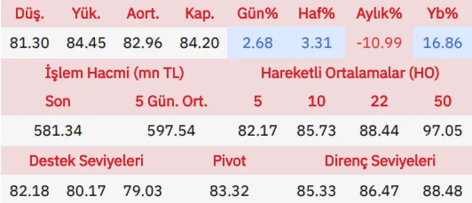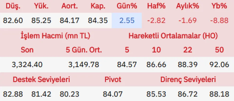 "Seans başlangıcında piyasada alımla başlayan Tekfen Holding hissesi, gün içinde en düşük olarak 81.3 seviyesine gerilerken en yüksek 84.45 değeri gördü ve günü seans açılışına oranla yüzde 2.68 yükselişle, önceki gün kapanış fiyatına göre yüzde 2.68 getiriyle tamamladı.Gün içinde şirket için ilk destek noktamız 82.18 ikinci destek noktası da 80.17 seviyeleri olacak, direnç bölgesi olarak da 85.33 ve 86.47 seviyeleri takibimizde olacak."