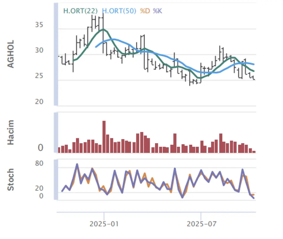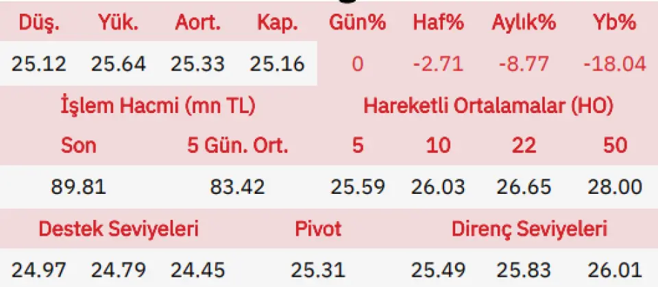 "Güne alımlarla başlayan Anadolu Grubu Holding hissesi, gün içinde en düşük olarak 25.12 seviyesine gerilerken en yüksek ise 25.64 seviyesini gördü ve günü açılışına göre aynı seviyede tamamladı.Hissede yaşanabilecek düşüşler için ilk destek noktamız 24.97 ve 24.79 seviyeleri seviyeleri takip edeceğimiz destek noktaları olacak, yükselişlerde de ilk olarak 25.49 daha sonrasında ise 25.83 seviyelerinde kâr satışlarının olabileceğini düşünüyoruz."