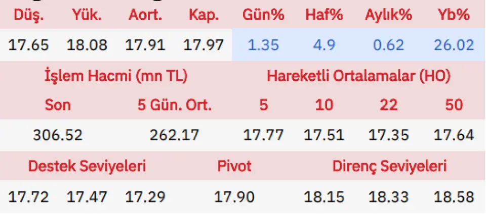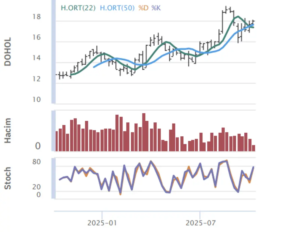 "Günü yükselişle açan Doğan Holding gün içinde 17.65 seviyesine gerilerken en yüksek ise 18.08 seviyesini gördü ve günü açılışına göre %1.07 yukarıda önceki güne göre de %1.35 yukarıda tamamladı.Doğan Holding hissesinde gün içinde olabilecek düşüşlerde ilk destek noktası 17.72 seviyesini onun altında da 17.47 noktasını bekliyoruz, yukarı yönlü hareketlerde de direnç noktaları olarak 18.15 ve 18.33 seviyelerini takip edeceğiz."