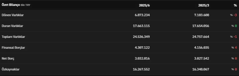 Toplam varlıklar 2025 yılının ikinci çeyreğinde 24.536.349.000 TL olarak açıklanmıştır. Finansal borçlar 2025 yılının ikinci çeyreğinde 4.307.122.000 TL olarak açıklandı.