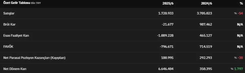 Şirket 2025 yılının ikinci çeyreğinde 1.720.933.000 TL satış gerçekleştirmiştir. 2024 yılının aynı dönemine oranla satış geliri %54 azalmıştır. 2024 yılının ikinci çeyreğinde satışlar 3.705.023.000 TL olarak kayıtlara geçmişti. 2025 yılının ikinci çeyreğinde brüt kar -21.677.000 TL olarak açıklanmıştır. 2024 yılının ikinci çeyreğinde ise bu veri 987.462.000 TL olarak açıklanmıştı.