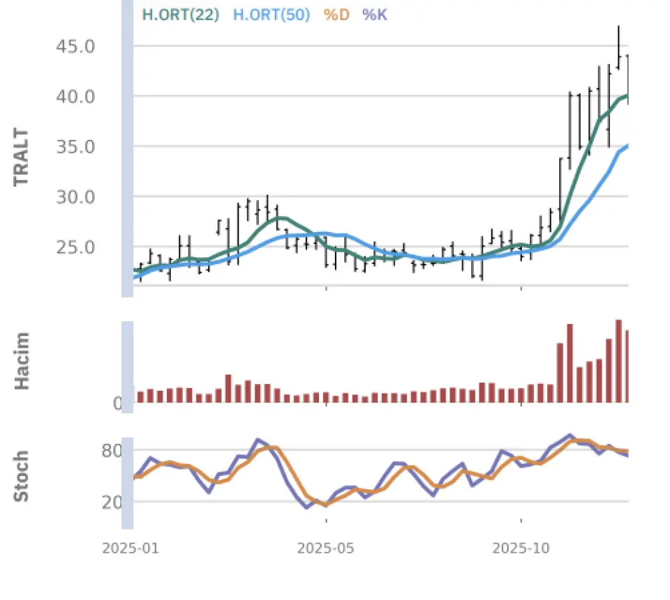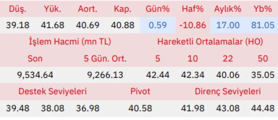 "Gün içinde en düşük 39.18 en yüksek 41.68 seviyesini gören Türk Altın İşletmeleri hissesinin günü %0.59 kazançla tamamladığı gözlenmektedir. Pivot seviye 40.58 seviyesinden geçmekte olup, aşağı yönlü hareketlerde birinci destek 39.48, ikinci destek ise 38.08 seviyesinden geçmektedir. Dirençler ise sırasıyla 41.98, 43.08 seviyelerinden geçmektedir. Bu aşamada endeksin 5 günlük HO seviyesinin %3.68 altında, 22 günlük HO seviyesinin ise %2.04 üstünde hareket ettiği dikkat çekmektedir. Son gün işlem hacmi ise bu aşamada 5 günlük ortalama işlem hacminin % 2.90 üstünde gerçekleşmiştir."