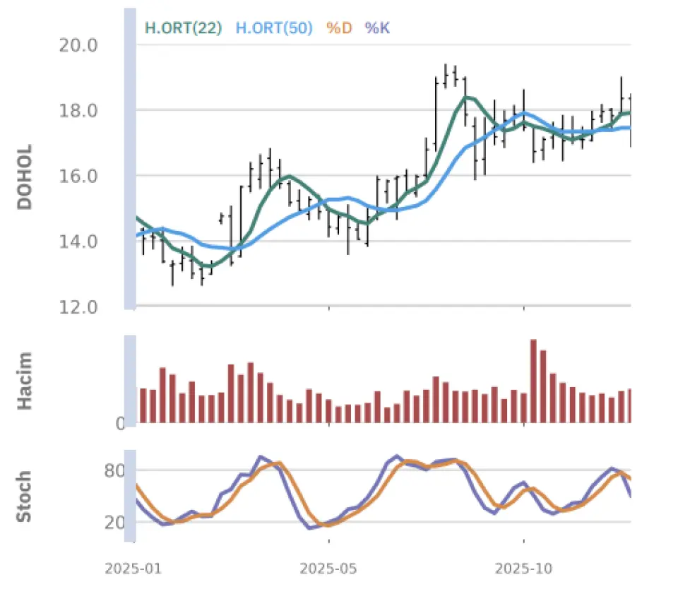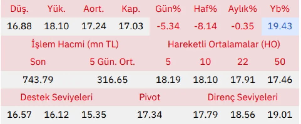 "Gün içinde en düşük 16.88 en yüksek 18.10 seviyesini gören Doğan Şirketler Grubu Holding hissesinin günü %5.34 kayıpla tamamladığı gözlenmektedir. Pivot seviye 17.34 seviyesinden geçmekte olup, aşağı yönlü hareketlerde birinci destek 16.57, ikinci destek ise 16.12 seviyesinden geçmektedir. Dirençler ise sırasıyla 17.79, 18.56 seviyelerinden geçmektedir. Bu aşamada endeksin 5 günlük HO seviyesinin %6.37 altında, 22 günlük HO seviyesinin ise %4.92 altında hareket ettiği dikkat çekmektedir. Son gün işlem hacmi ise bu aşamada 5 günlük ortalama işlem hacminin % 134.89 üstünde gerçekleşmiştir."