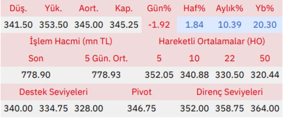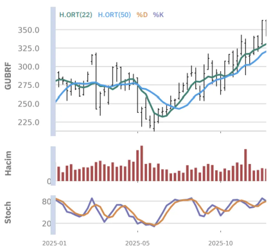 "Gün içinde en düşük 341.50 en yüksek 353.50 seviyesini gören Gübre Fabrikaları hissesinin günü %1.92 kayıpla tamamladığı gözlenmektedir. Pivot seviye 346.75 seviyesinden geçmekte olup, aşağı yönlü hareketlerde birinci destek 340.00, ikinci destek ise 334.75 seviyesinden geçmektedir. Dirençler ise sırasıyla 352.00, 358.75 seviyelerinden geçmektedir. Bu aşamada endeksin 5 günlük HO seviyesinin %1.93 altında, 22 günlük HO seviyesinin ise %4.46 üstünde hareket ettiği dikkat çekmektedir. Son gün işlem hacmi ise bu aşamada 5 günlük ortalama işlem hacminin % 0.00 altında gerçekleşmiştir."