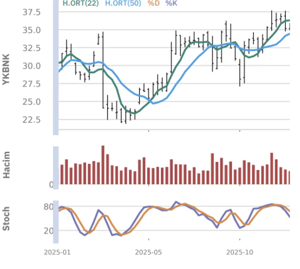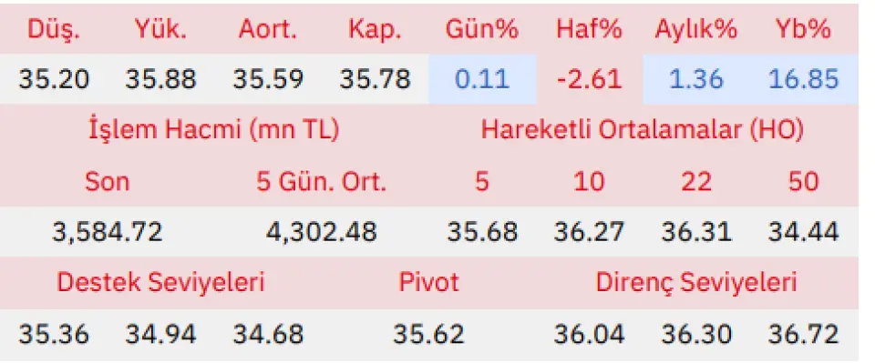"Gün içinde en düşük 35.20 en yüksek 35.88 seviyesini gören Yapı ve Kredi Bankası hissesinin günü %0.11 kazançla tamamladığı gözlenmektedir. Pivot seviye 35.62 seviyesinden geçmekte olup, aşağı yönlü hareketlerde birinci destek 35.36, ikinci destek ise 34.94 seviyesinden geçmektedir. Dirençler ise sırasıyla 36.04, 36.30 seviyelerinden geçmektedir. Bu aşamada endeksin 5 günlük HO seviyesinin %0.29 üstünde, 22 günlük HO seviyesinin ise %1.45 altında hareket ettiği dikkat çekmektedir. Son gün işlem hacmi ise bu aşamada 5 günlük ortalama işlem hacminin % 16.68 altında gerçekleşmiştir."
