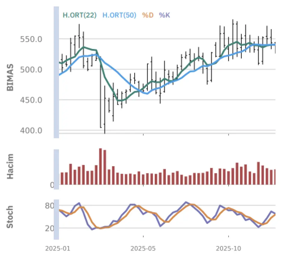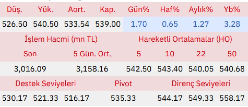 "Gün içinde en düşük 526.50 en yüksek 540.50 seviyesini gören BİM Birleşik Mağazalar hissesinin günü %1.70 kazançla tamamladığı gözlenmektedir. Pivot seviye 535.33 seviyesinden geçmekte olup, aşağı yönlü hareketlerde birinci destek 530.17, ikinci destek ise 521.33 seviyesinden geçmektedir. Dirençler ise sırasıyla 544.17, 549.33 seviyelerinden geçmektedir. Bu aşamada endeksin 5 günlük HO seviyesinin %0.65 altında, 22 günlük HO seviyesinin ise %0.19 altında hareket ettiği dikkat çekmektedir. Son gün işlem hacmi ise bu aşamada 5 günlük ortalama işlem hacminin % 4.50 altında gerçekleşmiştir."