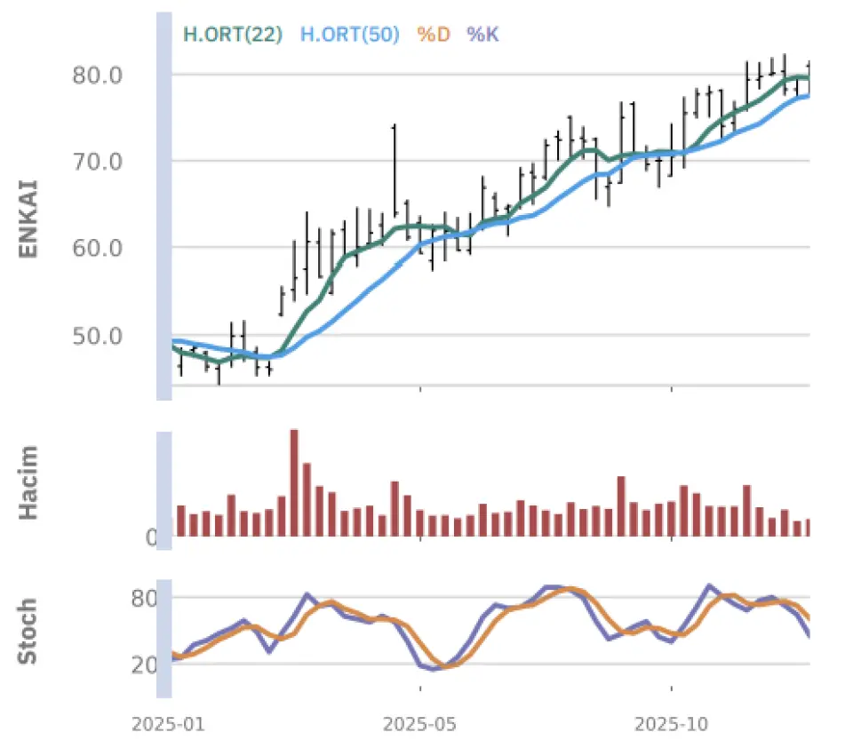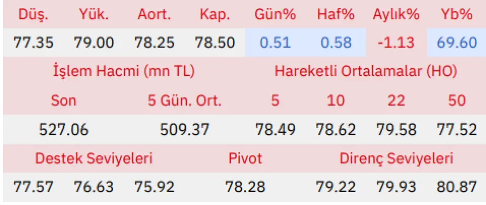 "Gün içinde en düşük 77.35 en yüksek 79.00 seviyesini gören Enka İnşaat ve Sanayi hissesinin günü %0.51 kazançla tamamladığı gözlenmektedir. Pivot seviye 78.28 seviyesinden geçmekte olup, aşağı yönlü hareketlerde birinci destek 77.57, ikinci destek ise 76.63 seviyesinden geçmektedir. Dirençler ise sırasıyla 79.22, 79.93 seviyelerinden geçmektedir. Bu aşamada endeksin 5 günlük HO seviyesinin %0.01 üstünde, 22 günlük HO seviyesinin ise %1.36 altında hareket ettiği dikkat çekmektedir. Son gün işlem hacmi ise bu aşamada 5 günlük ortalama işlem hacminin % 3.47 üstünde gerçekleşmiştir"