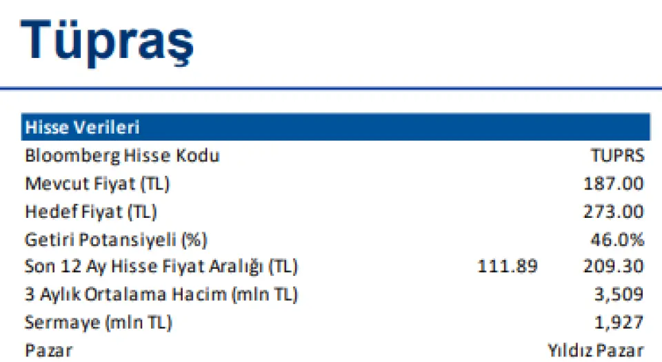 Deniz Yatırım Tüpraş (TUPRS) – AL – Hedef Fiyat: 273,00 TL
