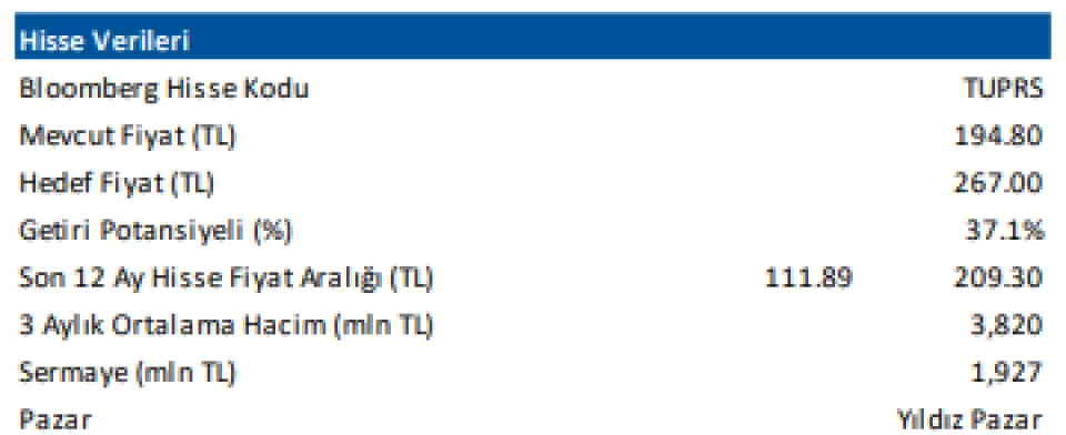 Deniz Yatırım TUPRS için 267 TL hedef fiyat tespit etti. Kurum hisseden %37,1 kazanç bekliyor.