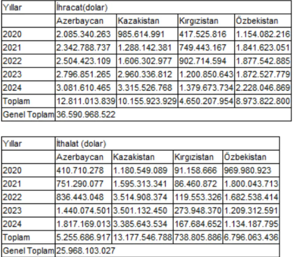 Türkiye İstatistik Kurumu (TÜİK) Genel Ticaret Sistemi verilerine göre, 2020-2024 döneminde Azerbaycan, Kazakistan, Kırgızistan ve Özbekistan'a toplam ihracat 36,6 milyar dolar oldu.