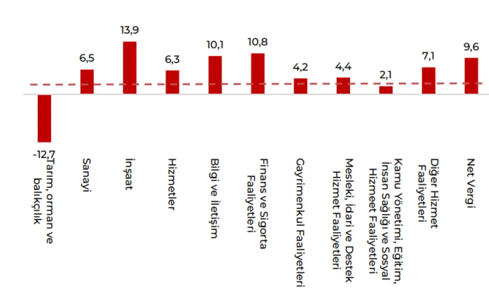 Büyüme faaliyetleri tarafında: tarım, orman ve balıkçılık, kamu yönetimi, eğitim, insan sağlığı ve sosyal hizmet faaliyetleri beklenti altı sonuçlanmış olup diğer tüm gruplar beklenti üzeri gerçekleşmiştir.