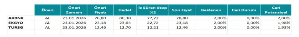 Aracı kurum tarafından paylaşılan "haftanın hisseleri" listesinde 3 hisse yer aldı. Bu hisseler AKBNK, EKGYO ve TURSG: