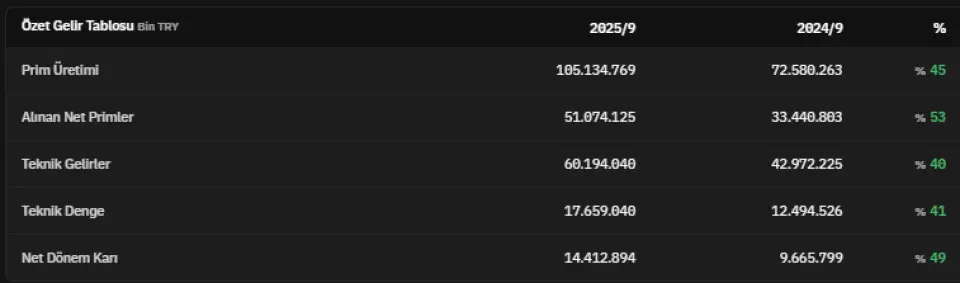 Teknik denge 2025 yılının üçüncü çeyreğinde 17.659.040.000 TL olarak açıklandı. 2024 yılının üçüncü çeyreğinde 12.494.526.000 TL olarak açıklanan teknik denge, 2025 yılının üçüncü çeyreğinde %41 artmış oldu. Net dönem kârı ise 14.412.894.000 TL olarak kaydedildi. İlgili veri 2024 yılının üçüncü çeyreğinde 9.665.799.000 TL olarak açıklanmıştı. Böylece net dönem karı, 2025 yılının üçüncü çeyreğinde %49 artmış oldu.