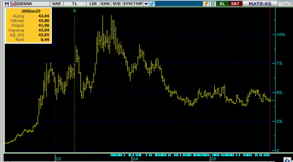 GESAN tam olarak 2 yıldır düşen trendde. Hisse 2023 yılı Eylül ayında 116 TL zirve fiyattan düşüş trendne girdi. O gün bu gündür düşüşte olan hisse, bu günlerde 42 TL civarı fiyatlardan işlem görüyor.