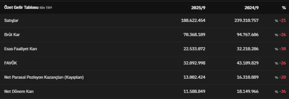 FAVÖK 2025 yılının üçüncü çeyreğinde 32.092.998.000 TL olarak açıklandı. Net parasal pozisyon kazançları (kayıpları) 2025 yılının üçüncü çeyreğinde 13.002.424.000 TL olarak kaydedildi. Net dönem kârı ise 11.588.849.000 TL olarak kaydedildi. İlgili veri 2024 yılının üçüncü çeyreğinde 18.149.966.000 TL olarak açıklanmıştı.