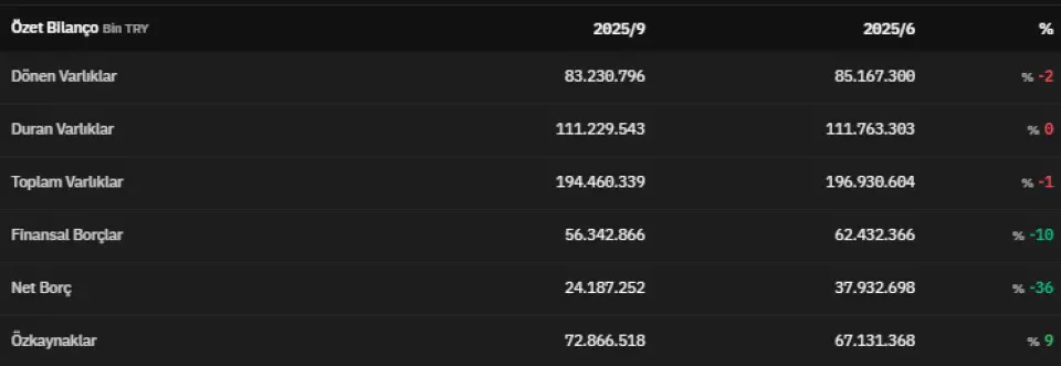 Dönen varlıklar 2025 yılının üçüncü çeyreğinde 83.230.796.000 TL olmuştur. 2025 yılının üçüncü çeyreğinde 111.229.543.000 TL olarak açıklanan duran varlıklar, 2025 yılının ikinci çeyreğinde 111.763.303.000 TL olarak açıklanmıştı. Toplam varlıklar üçüncü çeyrekte 194.460.339.000 TL olarak kaydedildi. Finansal borçlar 2025 yılının üçüncü çeyreğinde 56.342.866.000 TL olarak kaydedildi.