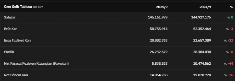 FAVÖK 2025 yılının üçüncü çeyreğinde 26.232.679.000 TL olarak açıklandı. Net parasal pozisyon kazançları 2025 yılının üçüncü çeyreğinde 5.838.533.000 TL olarak kaydedildi. Net dönem kârı ise 14.064.768.000 TL olarak kaydedildi. İlgili veri 2024 yılının üçüncü çeyreğinde 19.020.720.000 TL olarak açıklanmıştı.