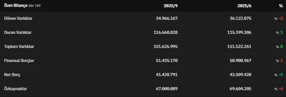 2025 yılının üçüncü çeyreğinde net borç 41.428.791.000 TL olarak açıklandı. Özkaynaklar 2025 yılının üçüncü çeyreğinde 67.000.089.000 TL olarak açıklandı. İlgili veri 2025 yılının ikinci çeyreğinde 69.604.205.000 TL olarak açıklanmıştı. Böylece özkaynaklar %4 azalmış oldu.