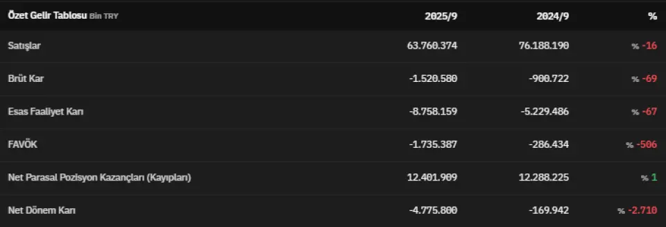 FAVÖK 2025 yılının üçüncü çeyreğinde -1.735.387.000 TL olarak açıklandı. Net parasal pozisyon kazançları 2025 yılının üçüncü çeyreğinde 12.401.909.000 TL olarak kaydedildi. Net dönem kârı ise -4.775.800.000 TL olarak kaydedildi. İlgili veri 2024 yılının üçüncü çeyreğinde -169.942.000 TL olarak açıklanmıştı.