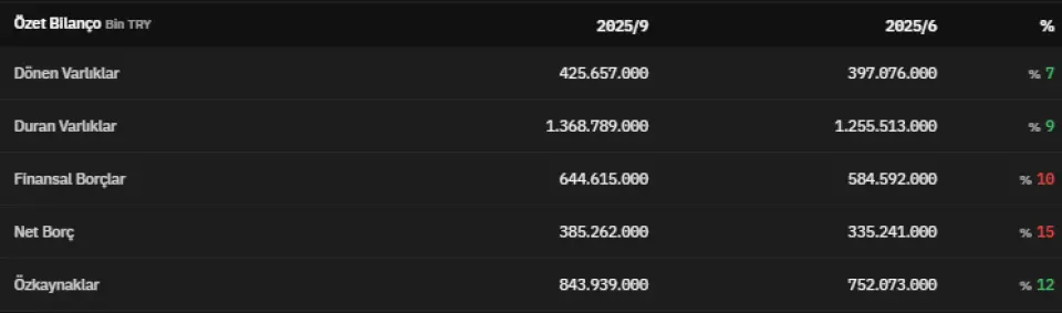 Dönen varlıklar 2025 yılının üçüncü çeyreğinde 425.657.000.000 TL olmuştur. 2025 yılının üçüncü çeyreğinde 1.368.789.000.000 TL olarak açıklanan duran varlıklar, 2025 yılının ikinci çeyreğinde 1.255.513.000.000 TL olarak açıklanmıştı. Finansal borçlar 2025 yılının üçüncü çeyreğinde 644.615.000.000 TL olarak kaydedildi.