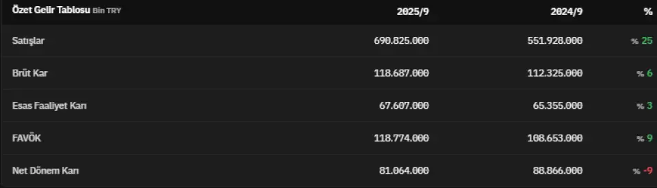 FAVÖK 2025 yılının üçüncü çeyreğinde 118.774.000.000 TL olarak açıklandı. Net dönem kârı ise 81.064.000.000 TL olarak kaydedildi. İlgili veri 2024 yılının üçüncü çeyreğinde 88.866.000.000 TL olarak açıklanmıştı. Böylece net dönem karı %9 azalmış oldu.