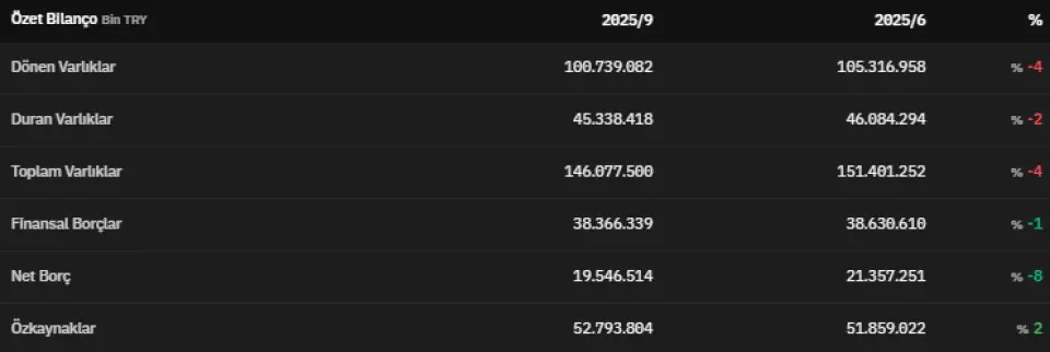Dönen varlıklar 2025 yılının üçüncü çeyreğinde 100.739.082.000 TL olmuştur. 2025 yılının üçüncü çeyreğinde 45.338.418.000 TL olarak açıklanan duran varlıklar, 2025 yılının ikinci çeyreğinde 46.084.294.000 TL olarak açıklanmıştı. Toplam varlıklar üçüncü çeyrekte 146.077.500.000 TL olarak kaydedildi. Finansal borçlar 2025 yılının üçüncü çeyreğinde 38.366.339.000 TL olarak açıklandı. 2025 yılının ikinci çeyreğinde 38.630.610.000 TL olarak açıklanan finansal borçlar, 3 çeyrekte %1 azalmış oldu. 2025 yılının üçüncü çeyreğinde net borç 19.546.514.000 TL olarak açıklandı. Özkaynaklar 2025 yılının üçüncü çeyreğinde 52.793.804.000 TL olarak açıklandı. İlgili veri 2025 yılının ikinci çeyreğinde 51.859.022.000 TL olarak açıklanmıştı. Böylece özkaynaklar, 2025 yılının 3. çeyreğinde %2 artmış oldu.