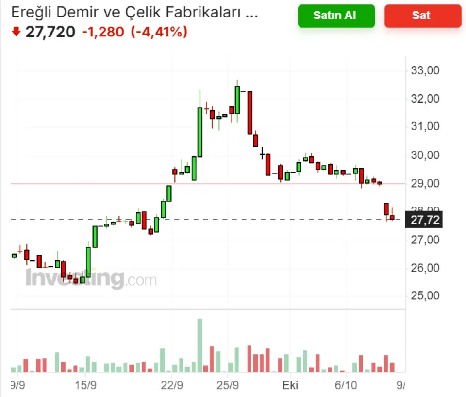 Ereğli Demir ve Çelik Fabrikaları T.A.Ş. (EREGL), 2025 yılı 2.çeyrek bilançosunda net karını 1.732.944.000 TL olarak açıkladı. Net kar 2024 yılının 2. çeyreğinde 9.986.795.000 TL olarak açıklanmıştı.Kardemir Karabük Demir Çelik Sanayi ve Ticaret A.Ş. (KRDMD), 2025 yılı 2.çeyrek bilançosunda net karını -254.216.000 TL olarak açıkladı. Net kar 2024 yılının 2. çeyreğinde -2.470.213.000 TL olarak açıklanmıştı.