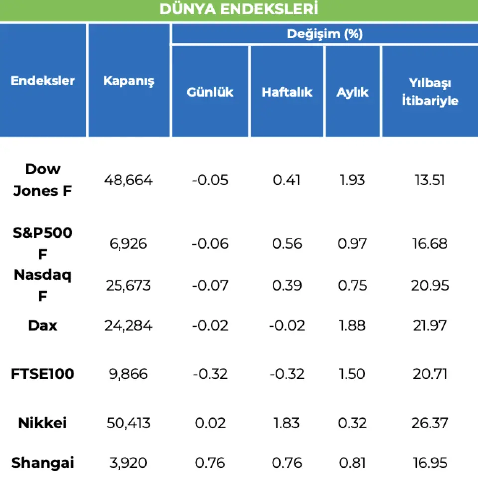 Avrupa Piyasaları: Avrupa piyasalarında hisse senetleri, küresel risk iştahındaki artışa paralel olarak temkinli fakat olumlu bir görünüm sergiliyor. Euro Stoxx 50 endeksine yönelik vadeli işlemler güne büyük ölçüde yatay başlarken, yatırımcılar hem ABD’deki yıl sonu rallisinin sürdürülebilirliğini hem de Avrupa Merkez Bankası’nın (ECB) 2026’ya dönük para politikası patikasını yakından izliyor. Avrupa borsalarında hareketin sınırlı kalmasında, son dönemdeki güçlü yükselişlerin ardından gelen kâr realizasyonları ve değerlemelere ilişkin soru işaretleri etkili oluyor.