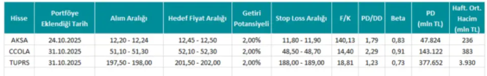 Hisselerin portföyle eklendiği tarih 24.10.2025 olarak kaydedildi. AKSA hissesi için hedef fiyat aralığı 12,20 - 12,24 olarak açıklandı. CCOLA hissesine açıklanan hedef fiyat aralığı ise 52,10 - 52,30 olarak listeye yansıdı. TUPRS hissesi için açıklanan hedef fiyat aralığı 201,50 - 202,00 olarak yatırımcılar ile paylaşıldı.
