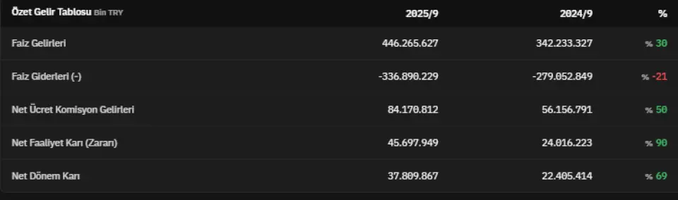 Faiz gelirleri 2025 yılının 3. çeyreğinde 446.265.627.000 TL olarak açıklandı. 2024 yılının 3. çeyreğinde 342.233.327.000 TL olan faiz gelirleri, 2025 yılının 3. çeyreğinde %30 artmış oldu. 2025 yılının üçüncü çeyreğinde faiz giderleri -336.890.229.000 TL olarak açıklandı. 2024 yılının üçüncü çeyreğinde ise bu veri -279.052.849.000 TL olarak açıklanmıştı. Net ücret komisyon gelirlerini 84.170.812.000 TL olarak açıklayan YKBNK, 2024 yılının üçüncü çeyreğinde net ücret komisyon gelirlerini 56.156.791.000 TL olarak açıklamıştı. Böylece ilgili veri %50 artmış oldu.Net faaliyet karı 2025 yılının üçüncü çeyreğinde 45.697.949.000 TL olarak açıklandı. 2024 yılının üçüncü çeyreğinde 24.016.223.000 TL olarak açıklanan net faaliyet karı, 2025 yılının üçüncü çeyreğinde %90 artmış oldu. Net dönem kârı ise 37.809.867.000 TL olarak kaydedildi. İlgili veri 2024 yılının üçüncü çeyreğinde 22.405.414.000 TL olarak açıklanmıştı. Böylece net dönem karı, 2025 yılının üçüncü çeyreğinde %69 artmış oldu.