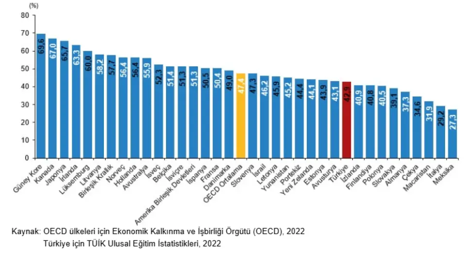 OECD ülkelerine ait en güncel veri yılı olan 2022 yılına göre, 25-34 yaş arası nüfusta yükseköğretim mezunlarının oranı incelendiğinde OECD ortalaması %47,4 iken, Türkiye ortalaması %42,9 oldu. OECD ülkeleri arasında yükseköğretim mezunu oranının en yüksek olduğu ülke %69,6 ile Güney Kore, en düşük olduğu ülke %27,3 ile Meksika oldu.