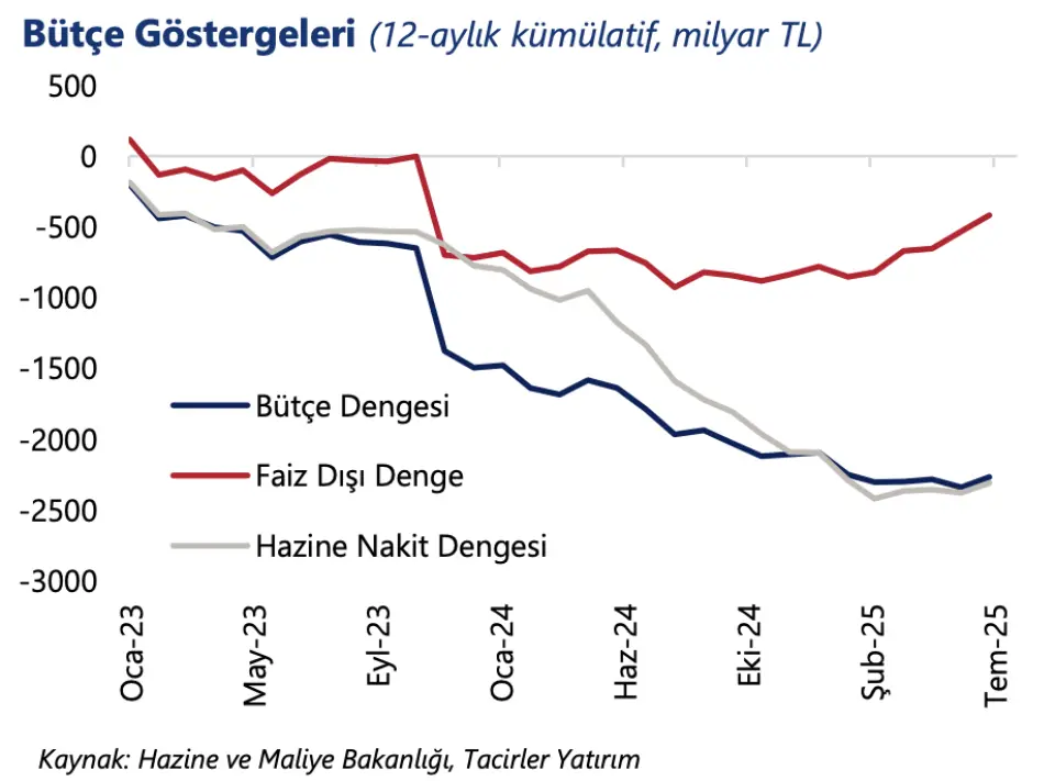 bütçe dengesinin ağustos ayında 65 milyar TL civarında fazla vereceğini tahmin ediyoruz. 2025 yıl sonu bütçe açığı tahminimizi yakın dönemde 1,9 trilyon TL (GSYİH’nin %3,1’i) düzeyinden 2,3 trilyon TL’ye (GSYİH’nın %3,7s’i) revize ettik.