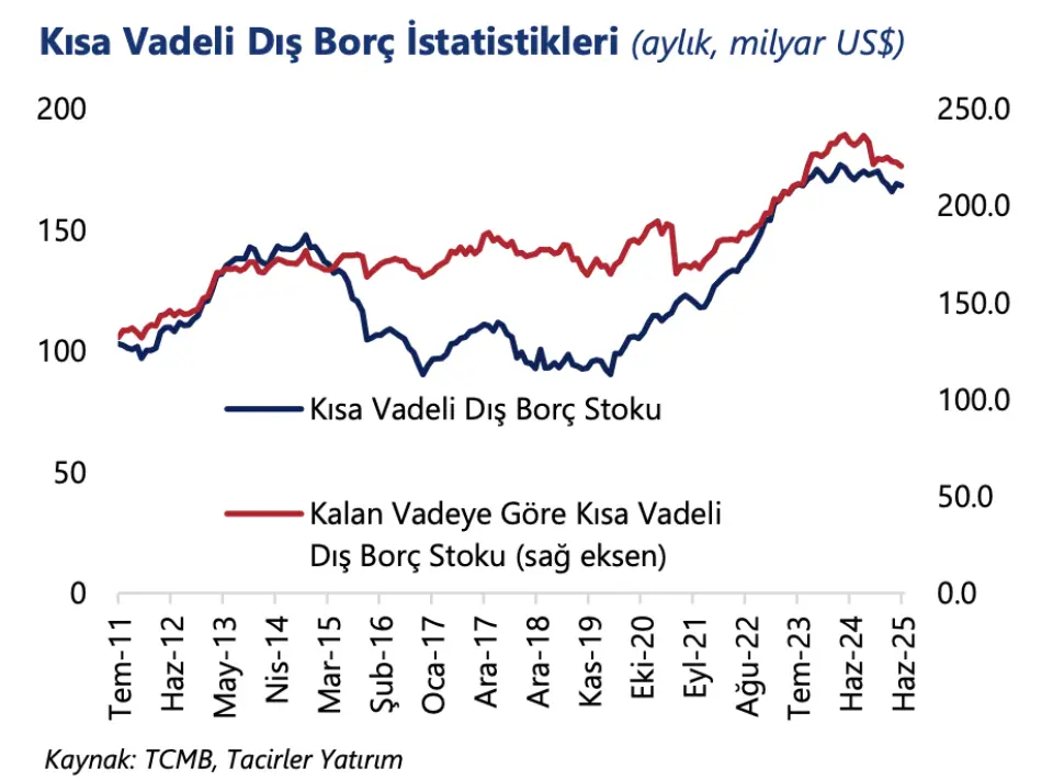 • Kısa vadeli dış borç stoku haziran ayında aylık bazda %0,4 azalarak 168,2 milyar dolar olarak gerçekleşti. Kısa vadeli dış borç verilerinde özellikle “kalan vadeye göre kısa vadeli dış borç stoku” verisini, diğer bir deyişle orijinal vadesine bakılmaksızın vadesine 1 yıl ve daha kısa kalan dış borçları yakından takip ediyoruz. Söz konusu borç stoku Haziran 2025 itibariyle 220,3 milyar dolar seviyesinde oluşmuş durumda.