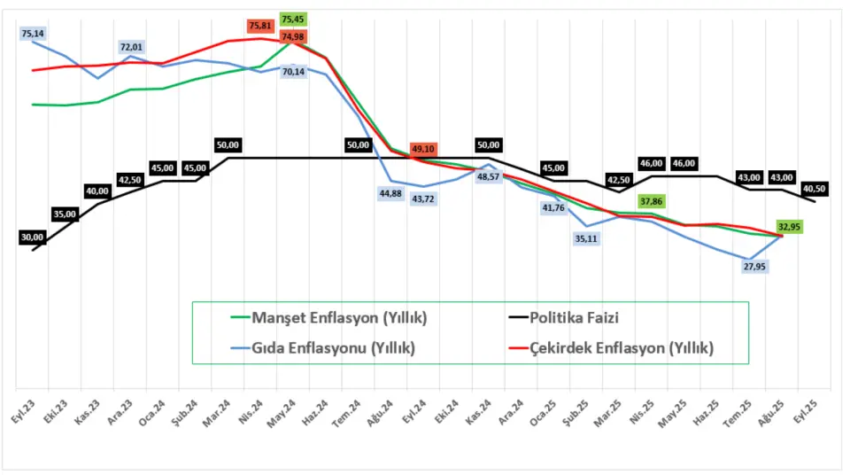 Enflasyon Ağustos döneminde yıllık bazda 33,52%’den 32,95%’e gerilemiş, bu da TÜFE tarafında artış hızının arka arkaya on beş ay boyunca yavaşladığını göstermişti. Aynı zamanda enflasyon Kasım 2021’den bu yana en düşük seviyelere ulaşmıştı. Enflasyonda yavaşlama genel olarak birçok kalemde hissedildi. Ulaşım enflasyonu 26,57%’den 24,86%’ya gerilerken, konut ve kamu hizmetler 62,01%’den 53,27%’ye gerileyerek öne çıkmıştı. Gıda ve alkolsüz içecekler, alkollü içecekler ve tütün ile iletişimde ise enflasyon hızlanmıştı. Aylık bazda enflasyon 2,04% düzeyinde gerçekleşmişti.
