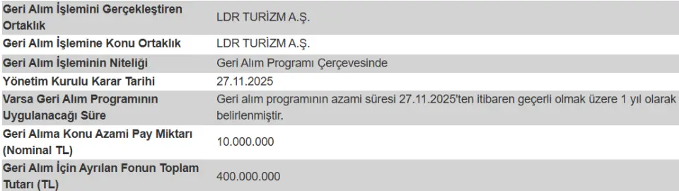 Lider Turizm LIDER dev bir pay geri alım programına başladı. Şirket tam 10 milyon lot hissesini borsadan geri alacak. Bu alış işlemi için şirket 400 milyon TL lik bir bütçe ayırdı.