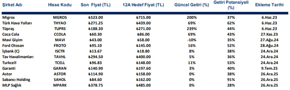 2026’ya girerken gözden geçirdiğimiz ve yeniden dizayn ettiğimiz Model Portföyümüzden Teknosa’yı çıkartırken, Sabancı Holding, Astor ve MLP Sağlık’ı portföye ekliyoruz. Türk Hava Yolları, Coca Cola İçecek, Ford Otomotiv, Mavi Giyim, Migros, TAV Havalimanları, Turkcell, Tüpraş, Garanti Bankası ve İş Bankası ise Model Portföyümüzde kalmaya devam ediyor. Model Portföyümüzde yer alan şirketleri ve performanslarını eşit ağırlıklı olarak takip ettiğimizi hatırlatalım.