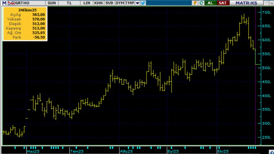 GRTHO yükselen piyasaya rağmen hafta boyunca değer kaybetti. Hisse, salı günü 681,50 TL fiyattan satış yemeye başladı. Cuma günü 512 TL fiyata kadar %25 oranında değer kaybeden hisse ne yazık ki bu fiyattan kapanış yaptı. Bu düşüş üzerine hissede kredili işlmeler ve açığa satış 1 ay süreyle yasaklandı.
