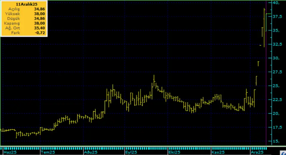 VKFYO 4 işlem yasağı ile işlem gören hisse idi. Hisse, 3 Aralık günü 21,12 TL fiyattan hareketlendi ve o gün 24,30 TL tavan fiyattan kapanış yaptı. Hızını alamayan hisse, sonraki günlerde de tavan tavan gitmeye devam etti ve 10 Aralık gğnğ 39 TL fiyata kadar primlenerek, 6 günde %100 e yakın prim yapmış oldu.