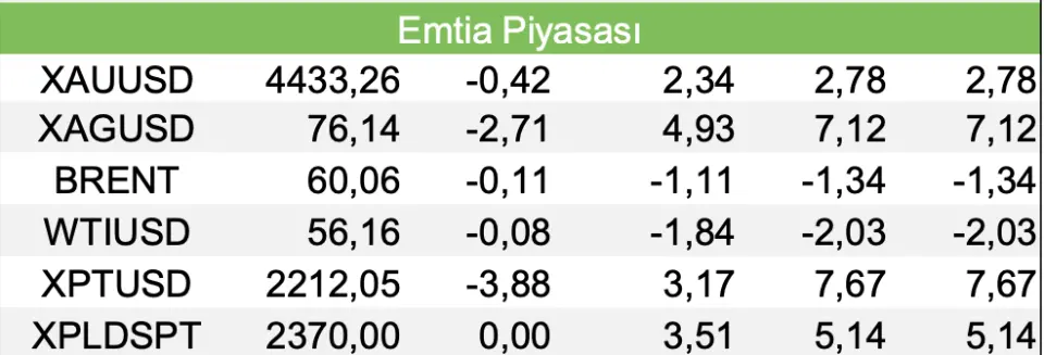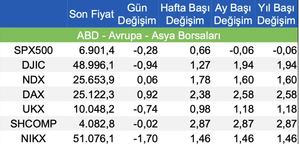 ABD Piyasaları: ABD piyasalarında genel görünüm riskten kaçış yönünde. ABD Hazine tahvillerinde (Treasuries) rallinin sürdüğü, özellikle 10 yıllık tahvil faizinin yaklaşık 1 baz puan gerileyerek yüzde 4,13 seviyesine indiği görülmekte. Piyasa güvenli liman talebini tahvillerden yana kullandı diyebiliriz. Bu hareketin temel nedeni, Aralık ayı ADP özel sektör istihdam verisinin beklentinin altında kalarak (41 bin, beklenti 50 bin) ekonomide ve işgücü piyasasında bir miktar yavaşlama sinyali vermesi oldu.
