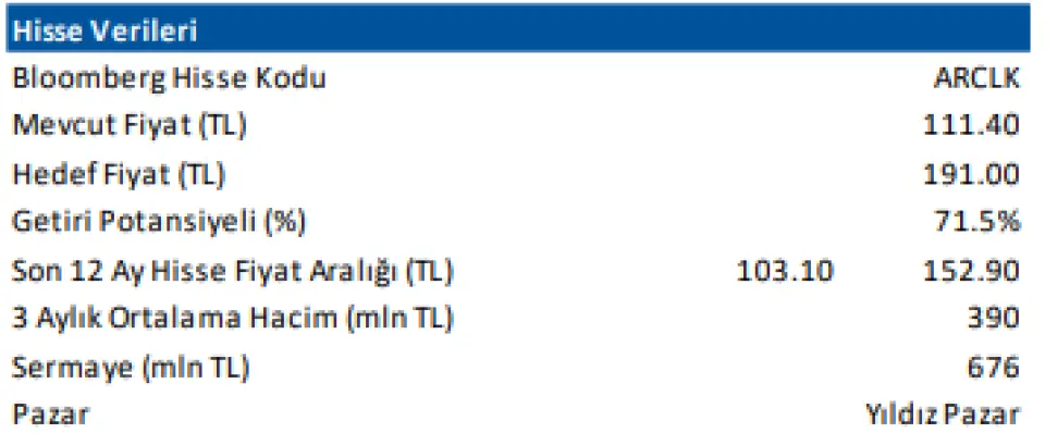 Deniz Yatırım ARCLK hissesine 191 TL hedef fiyat tespit etti. Bu hedef ile hissede beklenen kazanç oranı %71,5 oldu.