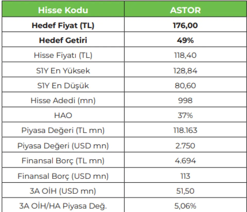 İnfo Yatırım ASTOR Hedef Fiyat: 176 TL, %48,6 Getiri Potansiyel