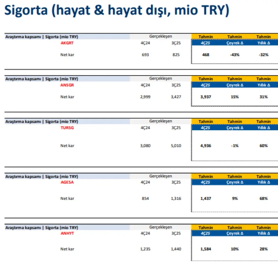 Halihazırda TURSG ve ANSGR tarafında yılbaşından bu yana güçlü prim üretim rakamları izlenirken, AKGRT cephesinde ise yılın ilk yarısında operasyonel kârlılığı artırma hedefi doğrultusunda daha temkinli üretim stratejisini takip etmiştik. 4Ç25’te geçen yılın aynı dönemine göre TURSG %46, ANSGR %30 ve AKGRT %16 prim üretimi ile karşımıza çıktı. Hayat dışı şirketlerde bu çeyrekte muallak tazminat karşılığından kaynaklanan net nakit akışlarının iskonto edilmesinde kullanılan oranın değiştirilmesi kaynaklı sınırlı olumsuz etki beklemekteyiz. ANSGR’nin çeyreklik ve yıllık bazda artış gösteren net kar rakamı ile pozitif ayrışmasını beklerken AKGRT tarafında karlılığın artan rekabete ek olarak vergi ve iskonto değişikliği ile baskılanmasını bekliyoruz.