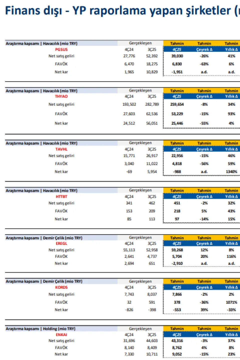 TAVHL: 4Ç25’te toplam yolcu sayısı %10 artarak 25,7 milyon seviyesine ulaşmıştır. Ciro ve FAVÖK tarafında büyümeler beklemekle beraber mevsimsel olarak son çeyrekte açıklanan zarar pozisyonunun devam etmesini bekliyoruz.