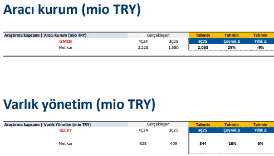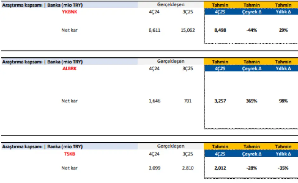ALBRK: Kredi büyümesinin, bankanın %50 olan öngörüsünü aşarak daha güçlü bir seviyede gerçekleşeceğini tahmin ediyoruz. Takipteki alacaklar oranının son çeyrekte bir miktar yükseliş göstermesi beklense de, bu oranın % 2 eşiğinin altında kalacağını hesaplıyoruz. Net kâr payı gelirlerinde, kâr-zarar ortaklığı projelerinin katkısıyla önceki çeyreklere kıyasla belirgin bir toparlanma; komisyon gelirlerindeki artış trendinin süreceğini ve bu kalemin kârlılığı desteklemeye devam edeceğini değerlendiriyoruz. Bankanın 2025 yılını, serbest karşılık iptalleri hariç yaklaşık 6 milyar TL net kâr ve %28 civarında bir özkaynak kârlılığı ile tamamlamasını beklemekteyiz.