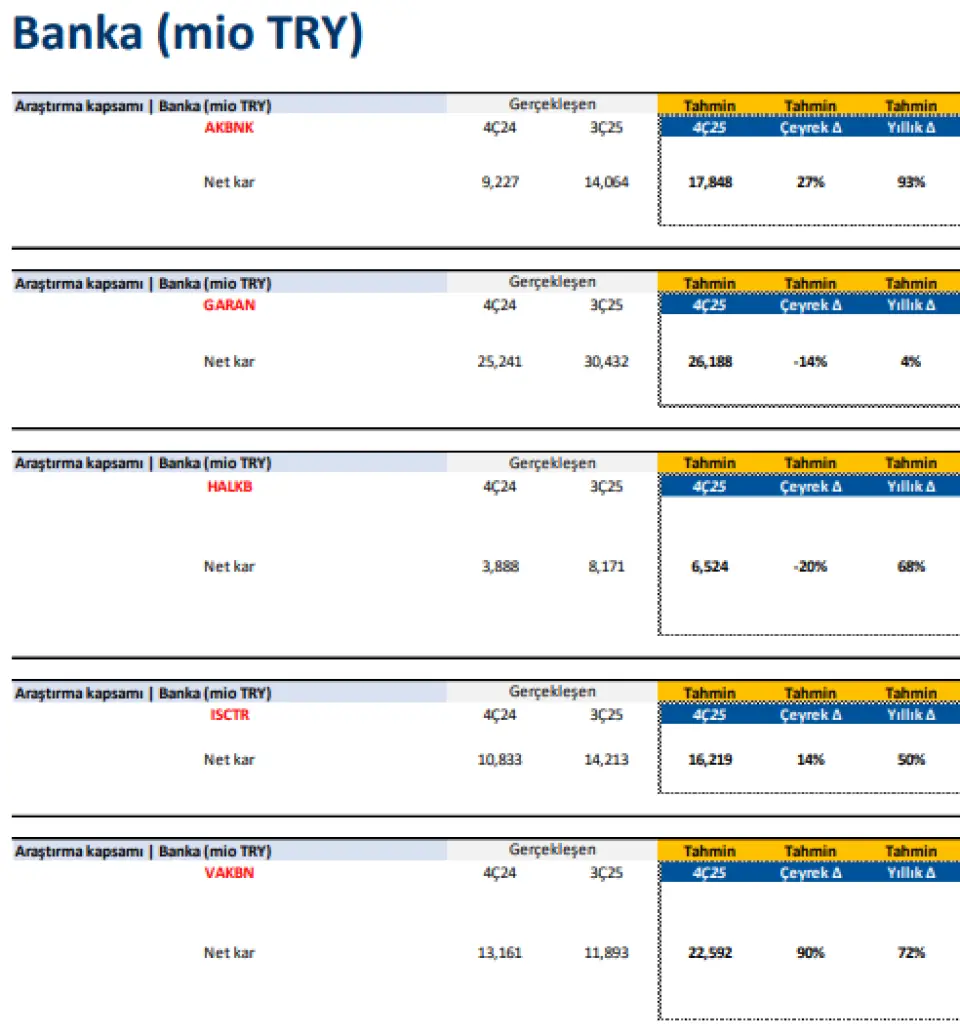 Aylık sektör verilerinden de görülebileceği üzere, kamu bankaları, özellikle VAKBN, özel bankalara göre kısmen daha pozitif net kar rakamlarına işaret etmektedir. Özel bankalar arasında ise AKBNK ve ISCTR diğerlerine kıyasla biraz daha ön plana çıkmaktadır. Bilanço döneminde takip edilecek konu başlıkları ise; kredi kompozisyonu, faiz kazandıran varlık ve faiz doğuran yükümlülüklerin yeniden fiyatlamaya kalan süreleri, TÜFE’ye endeksli bonoların portföydeki yeri ve kullanılan TÜFE varsayımı ve olası takibe intikaller ile ilgili bankaların 2026 yılına dair yönlendirmeleri olacaktır.