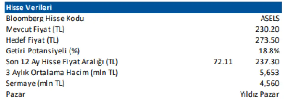 ASELS için daha önce 243,50 TL hedef fiyat açıklamış olan Deniz Yatırım hedefini yükseltti ve 273,50 TL ye çekti. Kurum hissede %18,8 kazanç öngörüyor.