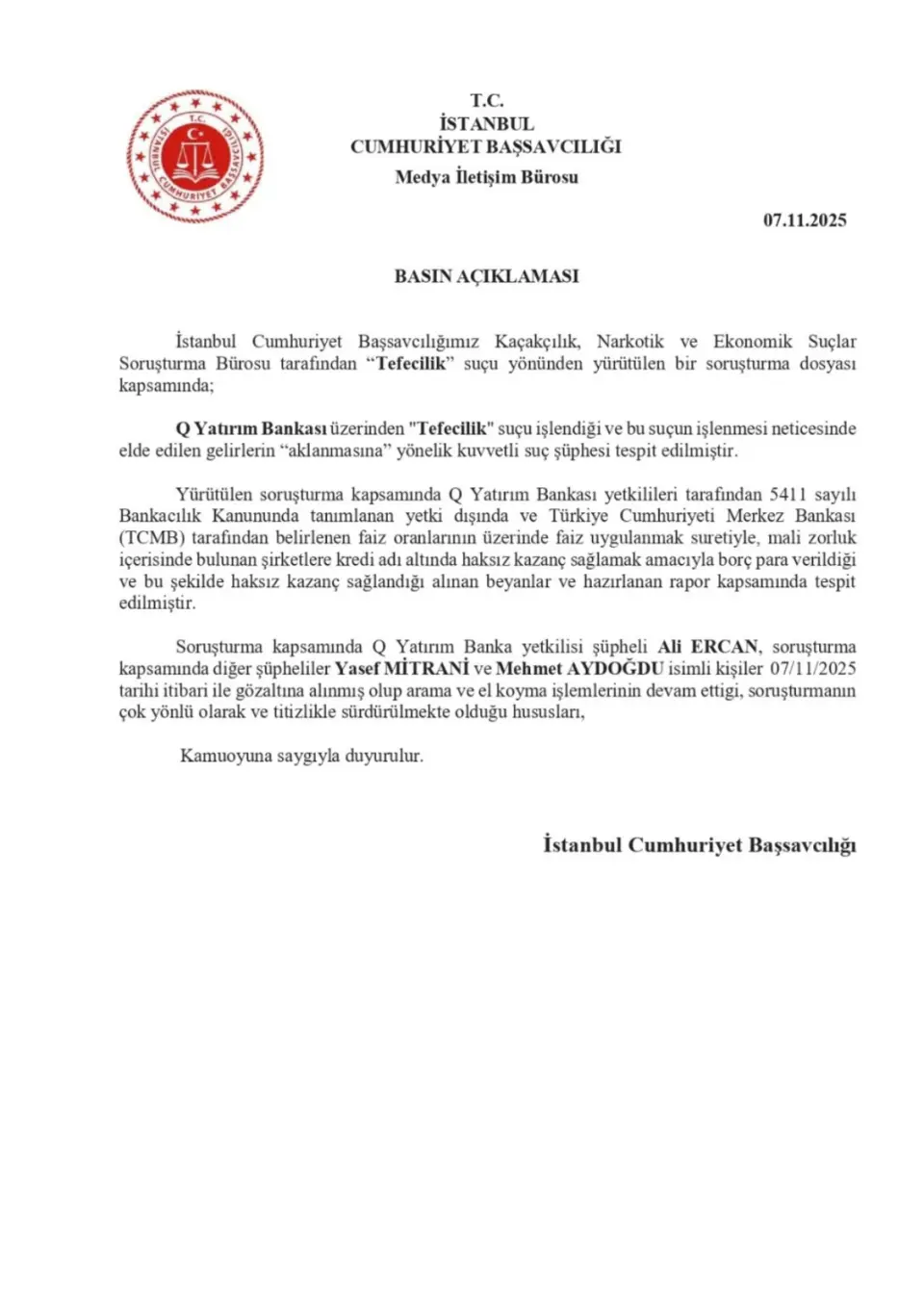 Savcılık tarafından yapılan açıklamada; banka üzerinden “tefecilik” suçu işlendiği ve bu suçtan elde edilen gelirlerin aklanmasına yönelik kuvvetli suç şüphesi elde edildiği bilgisi verildi. Alınan beyan ve hazırlanan rapora göre; banka yetkililerinin 5411 sayılı Bankacılık Kanunu’nda tanımlı yetkilerin dışında, Türkiye Cumhuriyet Merkez Bankası’nın (TCMB) belirlediği faiz oranlarının üzerinde faiz uygulayarak mali sıkıntı içindeki şirketlere “kredi” ismiyle borç para verdikleri ve bu şekilde haksız kazanç sağladıkları ileri sürüldü.