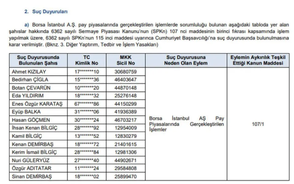 SPK'nın açıklamasında "Borsa İstanbul A.Ş. pay piyasalarında gerçekleştirilen işlemlerde sorumluluğu bulunan tabloda yer alan şahıslar hakkında 6362 sayılı Sermaye Piyasası Kanunu'nun (SPKn) 107 nci maddesinin birinci fıkrası kapsamında işlem yapılmak üzere, 6362 sayılı SPKn'nun 115 inci maddesi uyarınca Cumhuriyet Başsavcılığı'na suç duyurusunda bulunulmasına karar verilmiştir." ifadesi kullanılmıştı.